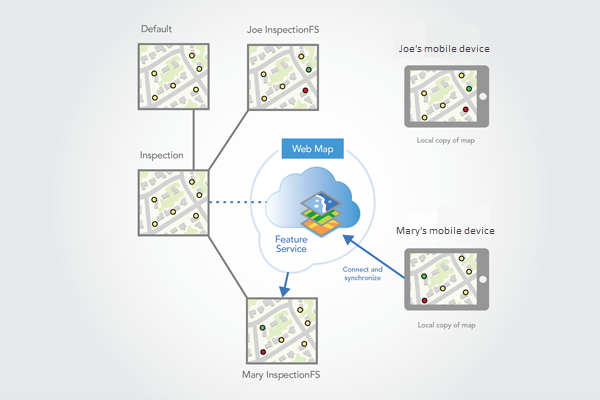 To do this, a web map is available in the company's organizational account for members of the office workers group. A worker who is a member of this group can access the web map using the app running on a mobile device on the internal network in the office. Before leaving the office, the worker downloads the map to the app. The worker then goes into the field and inspects the requested updates while off the network. When back in the office, the worker's corrections are synchronized with the feature service and reconciled and posted with the default version.