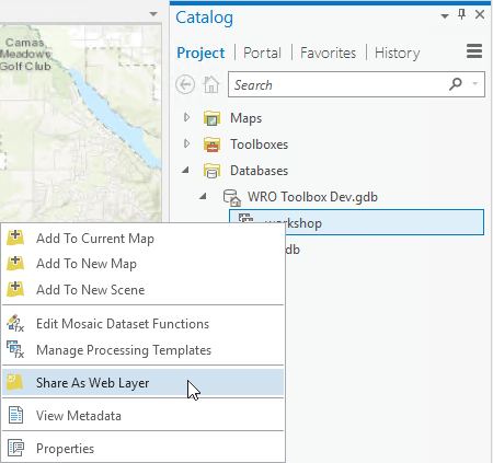 2. In ArcGIS Pro, browse to the mosaic dataset you created, right–click the mosaic dataset, and click Share As Web Layer Publish Web Layer.
